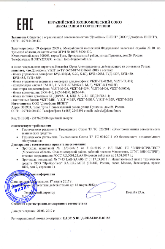 Блок управления домофона БУД-485М Vizit купить в Перми в компании ВИПАКС.