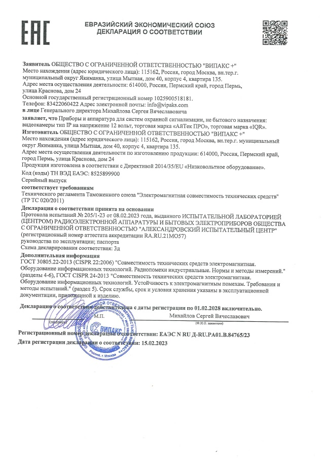 • Дальность действия ИК-подсветки До 30 м