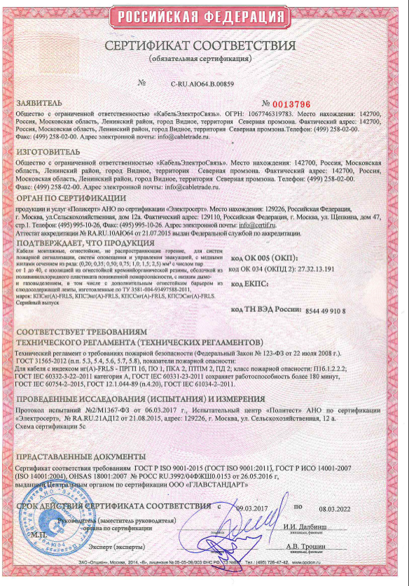 • Огнестойкий кабель предназначен для одиночной и групповой прокладки в системах противопожарной защиты, охранно-пожарной сигнализации (ОПС), оповещения и управления эвакуацией людей при пожаре (СОУЭ), аварийного оповещения на путях эвакуации, аварийной вентиляции и противодымной защиты, автоматического пожаротушения, а так же в зданиях, сооружениях и строениях, где предъявляются требования к кабелям и проводам по сохранению работоспособности в условиях пожара (ГОСТ 53315-2009)